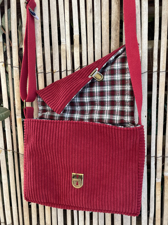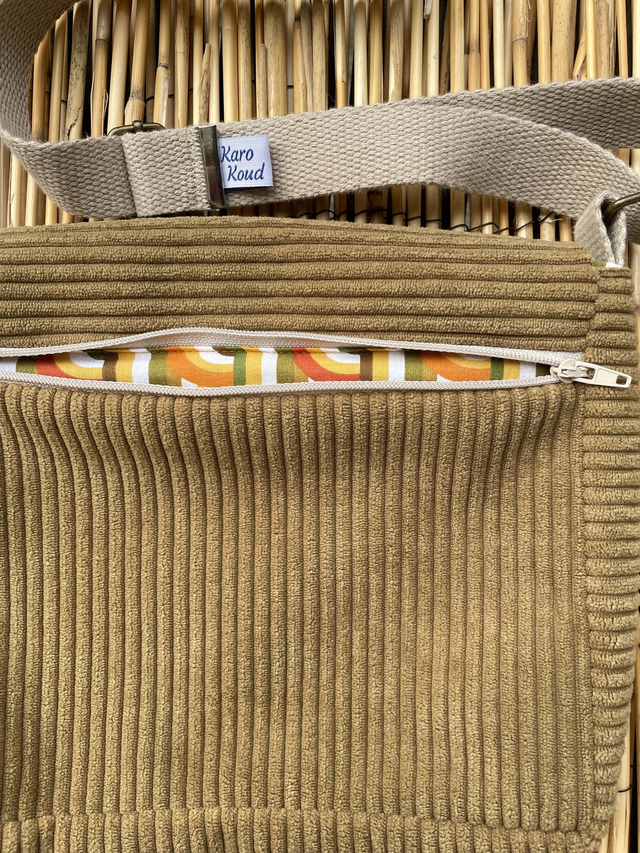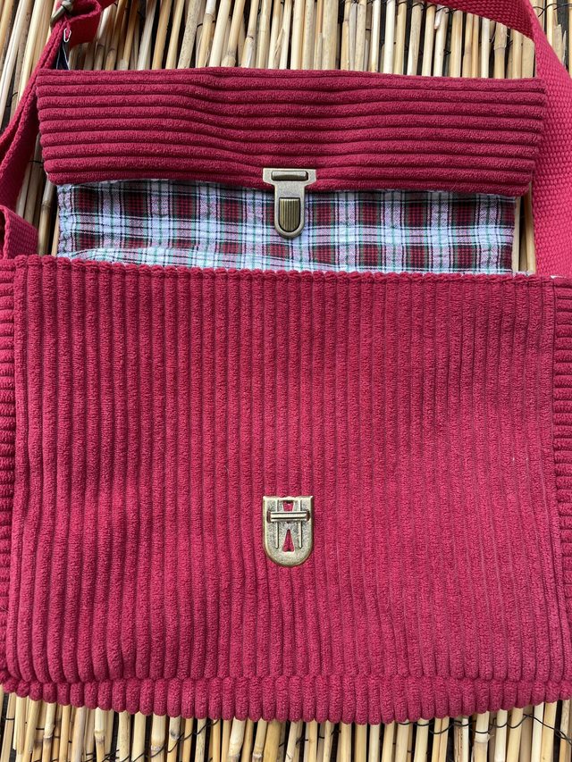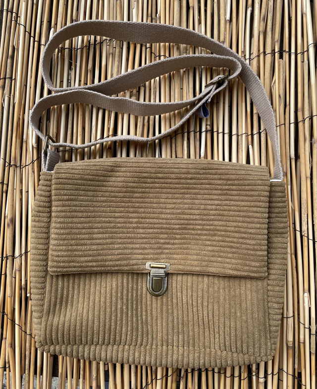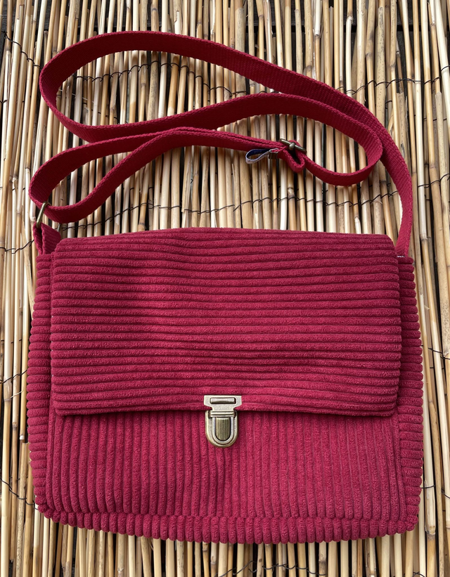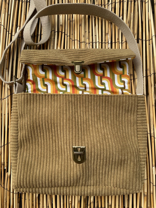 Sac cartable à bandoulière en velours côtelé large. Petit sac à main. Fermeture bouton poussoir et poche plaquée zippée