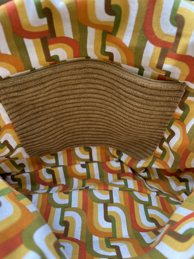 => l'un de couleur bronze avec un doublure en tissu coton aux motifs vintages dans des tons orange/vert/blanc. Ce modèle est agrémenté d'une petite poche intérieure réalisée avec un morceau de tissu velours identique au sac.
